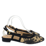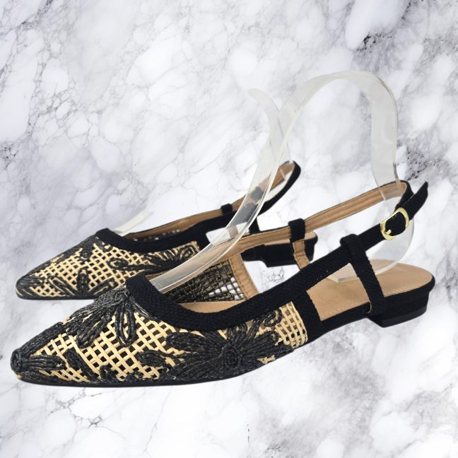Espectacular zapato de puntera combinado a dos tonos, semidescubierto realizado en simil de fibra de yute a modo de malla y con flores superpuestas en el mismo material . Sujeción con hebilla al talón tapa forrada del mismo material. Altura aprox 2 cm . Forro de fino tul para evitar que abra o deforme. Una auténtica monada