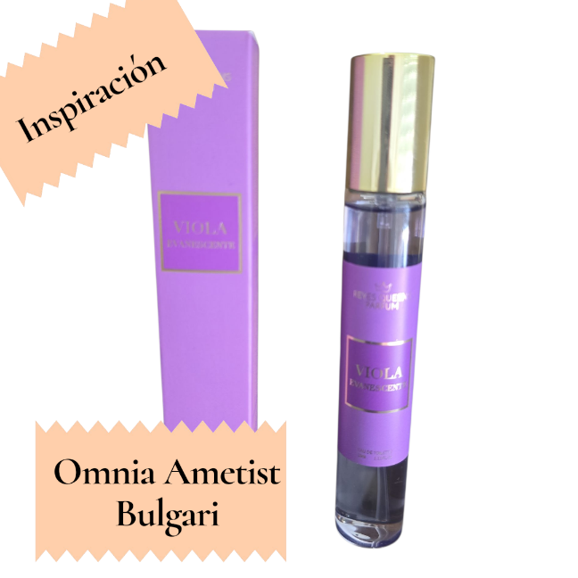 Perfume de inspiración a Omnia Amethyste de Bvlgari.Máxima similitud en sus notas olfativas.Ideal para llevar en el bolso, de viaje…Si tienes el original te sorprenderás; si no lo tienes no te arrepentirás de pedirlo.Descubrelo!