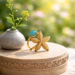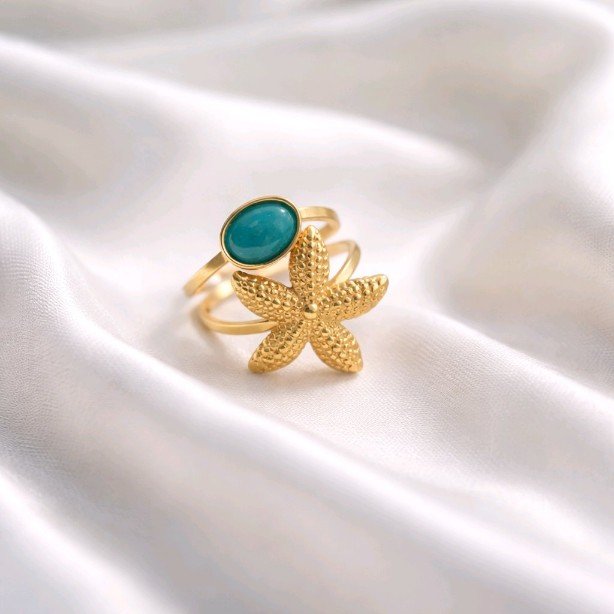 Precioso anillo regulable ,realizado en acero , la base de doble filamento con diseño de pieza pequeña turquesa central junto a una estrella de mar texturizada.Completa cualquier look y cautiva la mirada de cualquiera.Una pieza preciosa y singular
