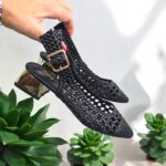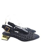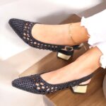 Zapato en polipiel tejida efecto rejilla con puntera redondeada y un ancho asequible. Traemos este modelo porque no es excesivamente picudo y se adapata a casi todos los pies. Tacón cuadrado en espejo dorado. Sujeción al talón con hebilla , bonito, elegante, atemporal para todos los looks, más casual con vaquero, arreglado con vestido Altura: aprox 4 cm